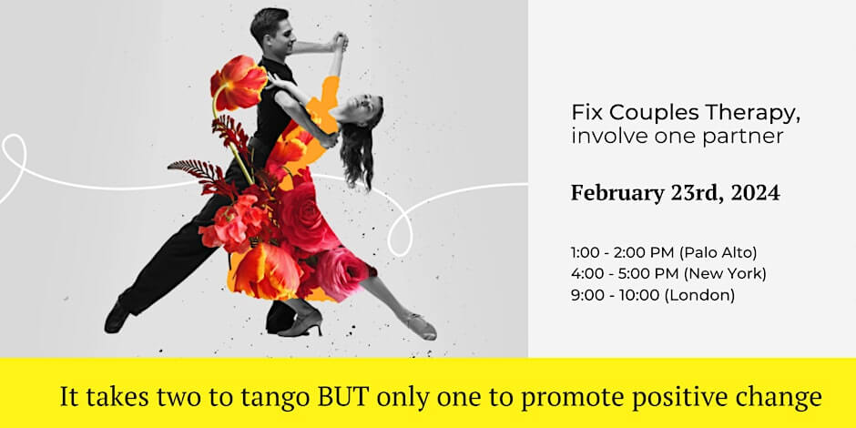 In the dance of relationships, it often feels like both partners need to be equally engaged for change to occur. However, in our transformative workshop, «It Takes Two to Tango BUT Only One to Promote Positive Change,» we challenge this notion and introduce a groundbreaking approach that empowers therapists to facilitate meaningful progress, even when only one partner is ready or willing to take the steps needed for change.